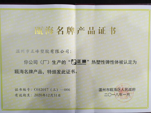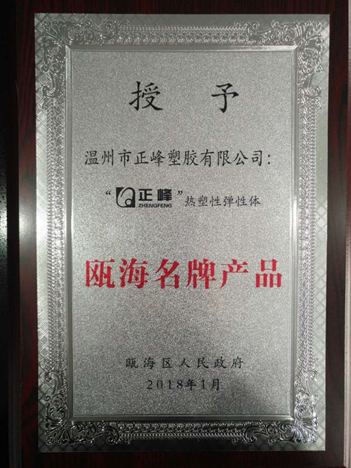 繼 2016年被評為“國家高新技術(shù)企業(yè)”后,正峰塑膠再次傳來喜訊,我公司生產(chǎn)的熱塑性彈性體被甌海區(qū)人民政府授予“甌海名牌產(chǎn)品”稱號,使我公司品牌建設(shè)之路往前邁出了跨越性的一步!
